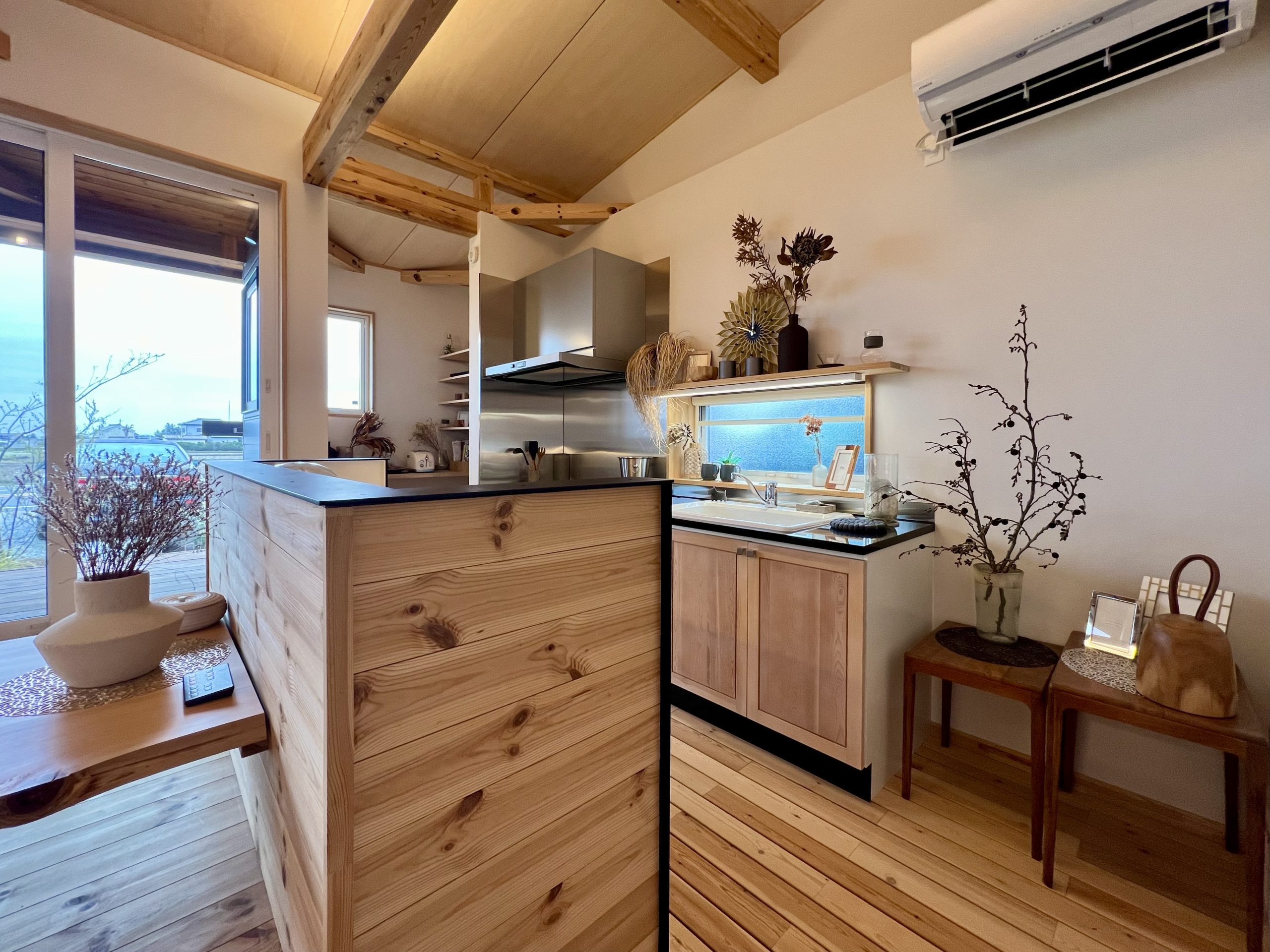 この家は、BinOの人気平屋モデル COVACO をベースに、さらに空間の広がりと楽しさをプラスした平屋です。外の世界とフラットにつながるCOVACOの特長を活かしながら、上部に設けたロフトが暮らしの自由度を高めています。